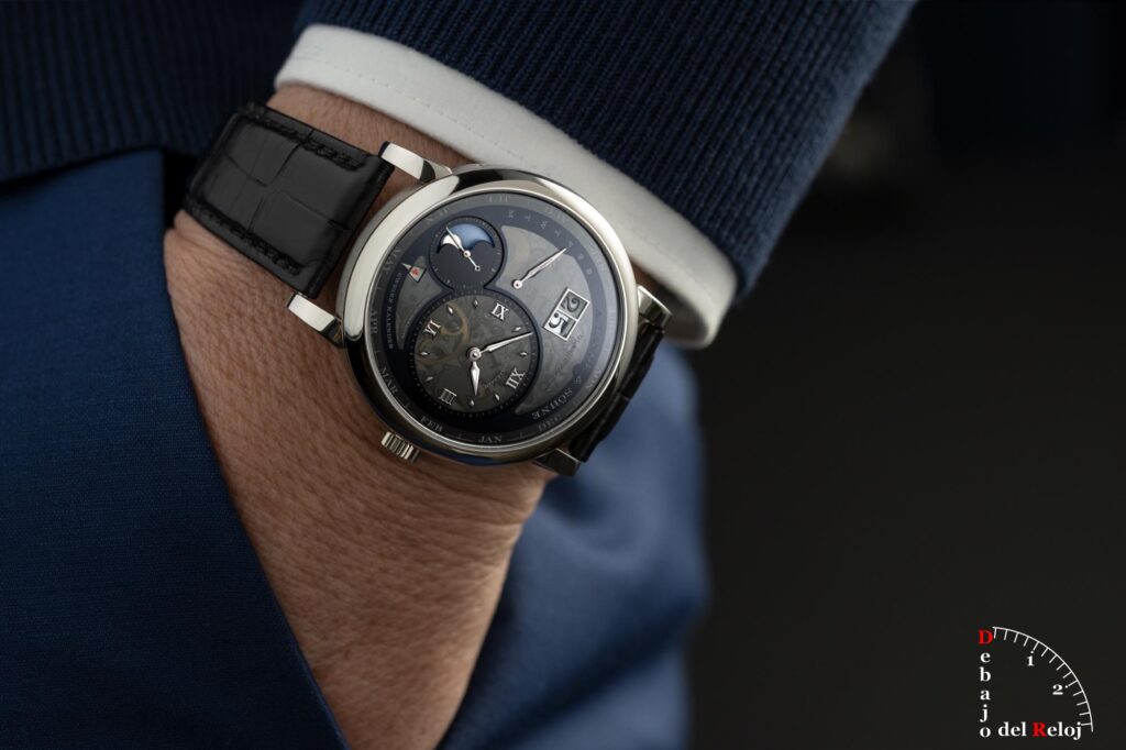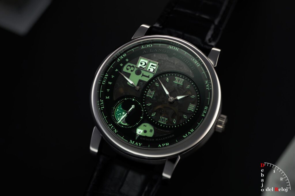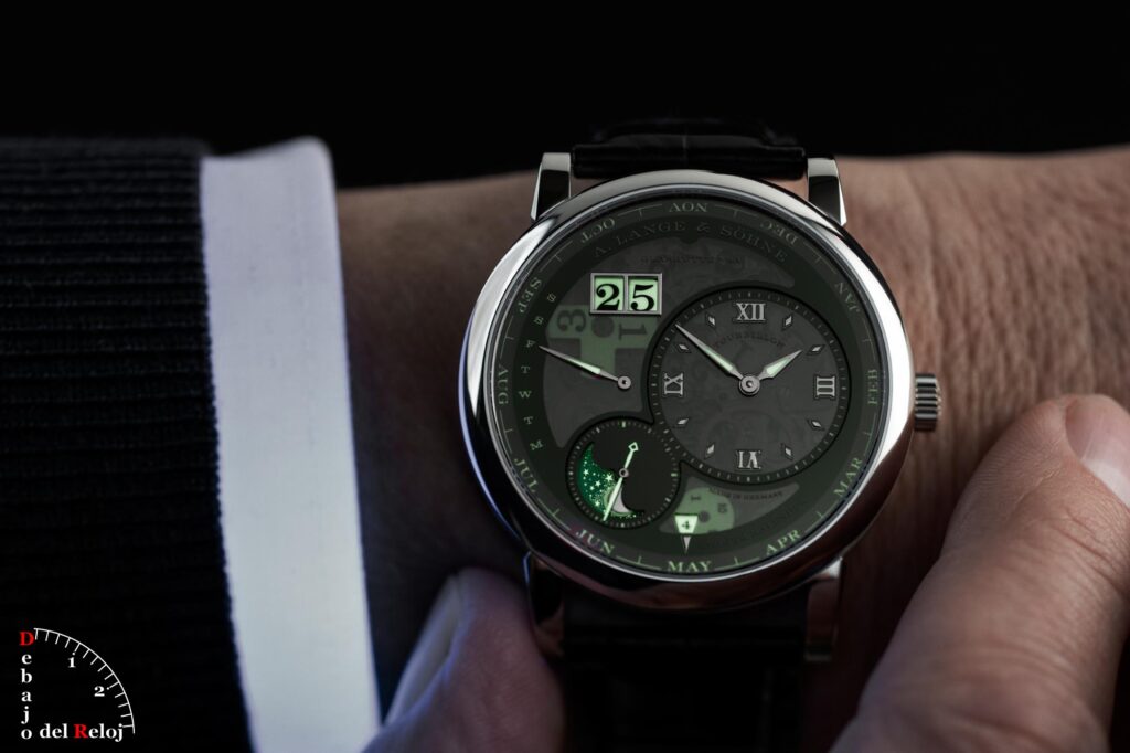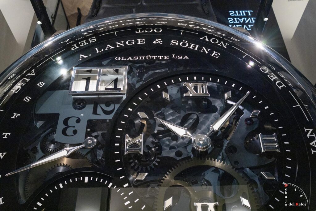 Antes de nada recordaros que todos los aspectos técnicos han sido tratados aquí: https://www.debajodelreloj.com/a-lange-sohne-lange-1-tourbillon-calendario-perpetuo-lumen/. El primer contacto con este modelo lo hemos tenido al entrar el el espacio de A.Lange & Söhne, dado que es el modelo al que han dedicado la tradiciónal maqueta que da la bienvenidos a los visitantes.