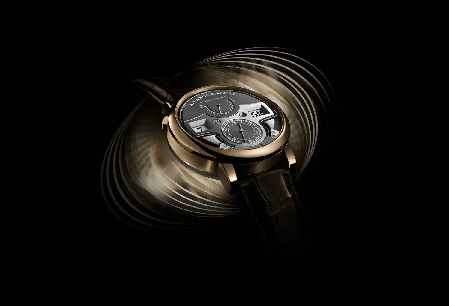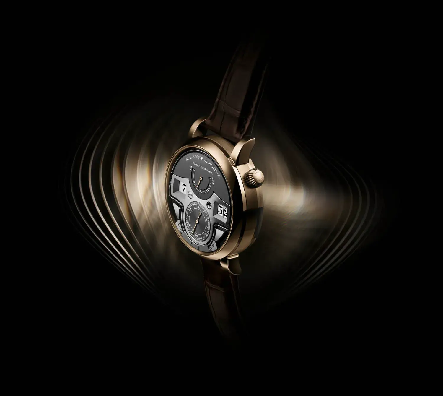A. Lange & Söhne presentó en 2015 con el ZEITWERK REPETICIÓN DE MINUTOS de platino una interpretación enteramente nueva de esta clásica complicación, cuyo mecanismo de extraordinaria complejidad técnica se puede oír cuando se desee. En lugar de sonar como es habitual cada cuarto de hora, lo hace en intervalos de diez minutos, correspondiendo así con toda exactitud su exclusivo sistema acústico con la indicación mecánica digital del tiempo. Si se acciona el pulsador a las 10 horas, suena un tono bajo por cada hora transcurrida, un tono doble (alto/bajo) por cada intervalo de diez minutos, y un tono alto por cada minuto. La hora que aparece en la imagen, las 7:52, sonaría con siete tonos bajos, cinco dobles tonos y dos tonos altos. Se ve lo que se oye, y se oye lo que se ve.