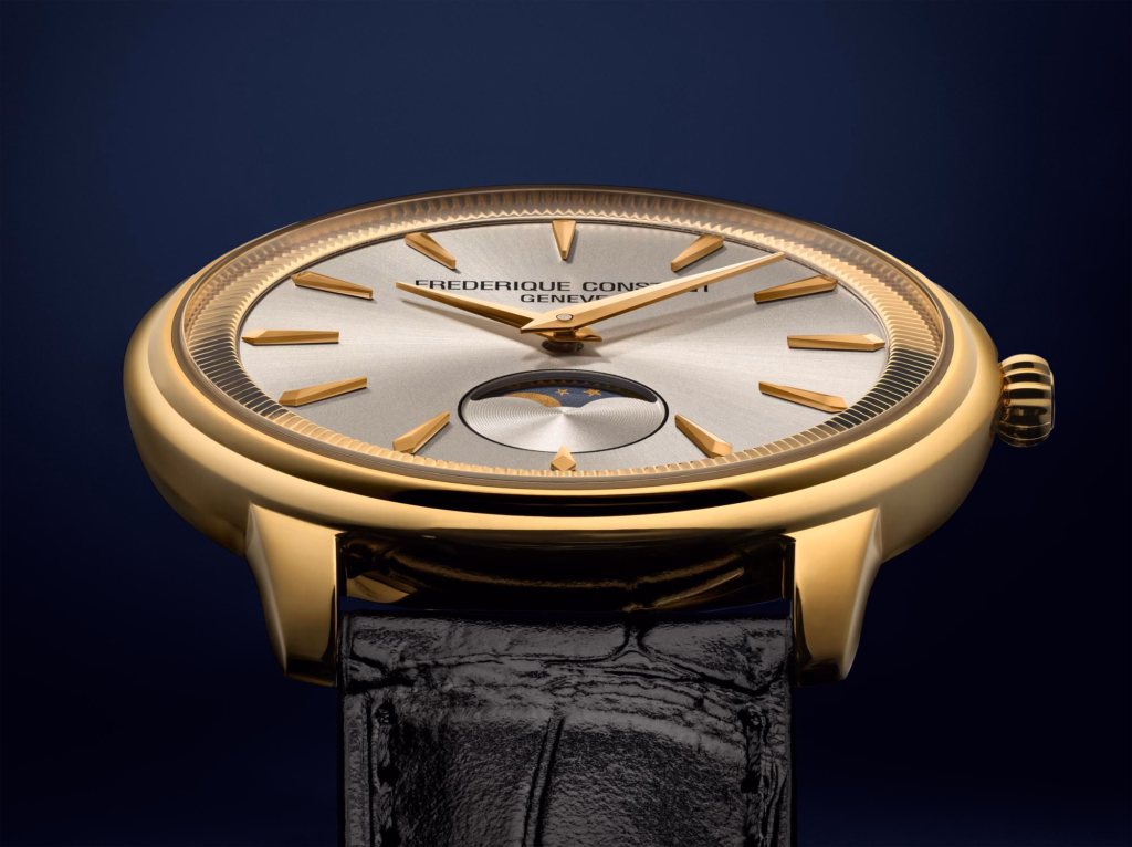 Dos nuevas versiones en las que Frederique Constant incorpora, en el primer reloj, una caja de PVD color oro amarillo, con agujas e índices del mismo tono, para lograr un aspecto clásico y sofisticado. El segundo incorpora por primera vez un brazalete de malla milanesa, que refuerza los tonos acerados de la caja, el exterior y la luna visible a las 6 horas.