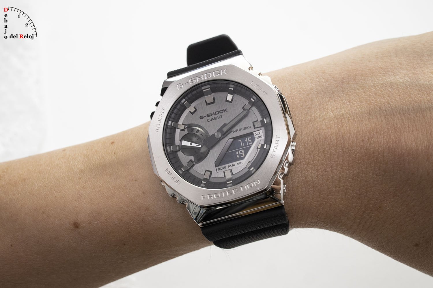 La caja es de acero con un tamaño de 49.3 mm x 44.4 mm, un grosor de 11.8 mm y un peso de 72 gramos. Si lo comparamos con las medidas del GA-2100, 48.5 mm × 45.4 mm y mismo grosor, vemos el esfuerzo realizado para conservar su estilo y comodidad. Respecto a los acabado, tiene juego de cepillados y pulidos que le quedan realmente bien. Un detalle que puede que no se aprecie bien en las fotografías es que su estructura interior es el Carbon Core Guard de G-Shock para proteger el módulo. El cristal es mineral plano. La resistencia al agua de estos relojes es hasta 20 bar, 200 metros.