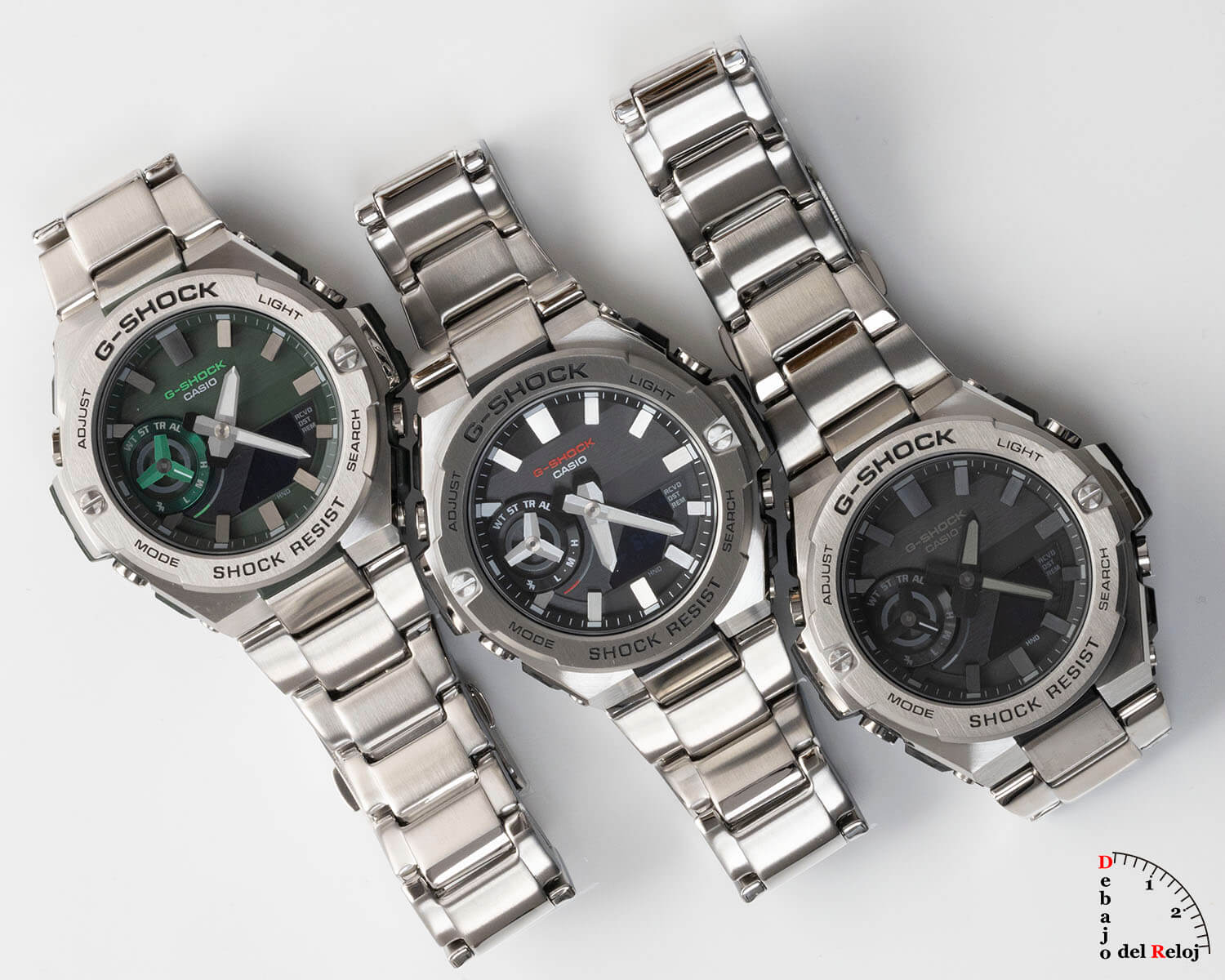 Continuamos la semana con el nuevo G-Shock GST-B500D de la casa Casio. Un nuevo diseño que viene en 5 estilos diferentes, de los que dos de ellos no estarán en venta en Europa, con caja dorada y de color negro. Ahora los hemos podido conocer, tocar y, por supuesto, fotografiar. Los relojes que han pasado por nuestro estudio son en colores negro(GST-B500D-1A), verde (GST-B500AD-3A) y una esfera con detalles en negro y gris (GST-B500D-1A1).