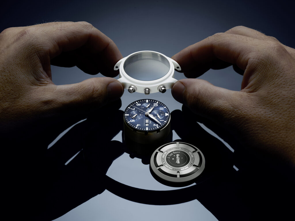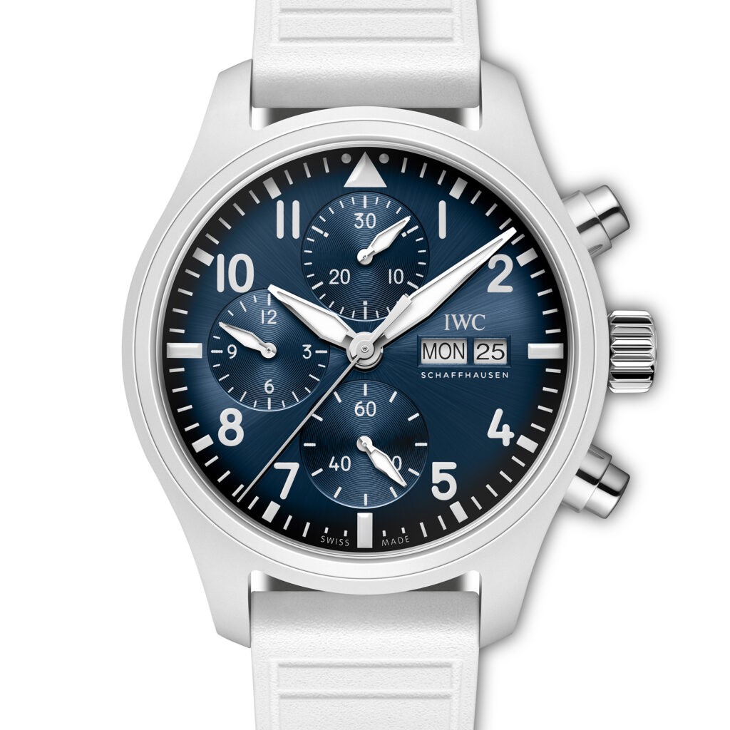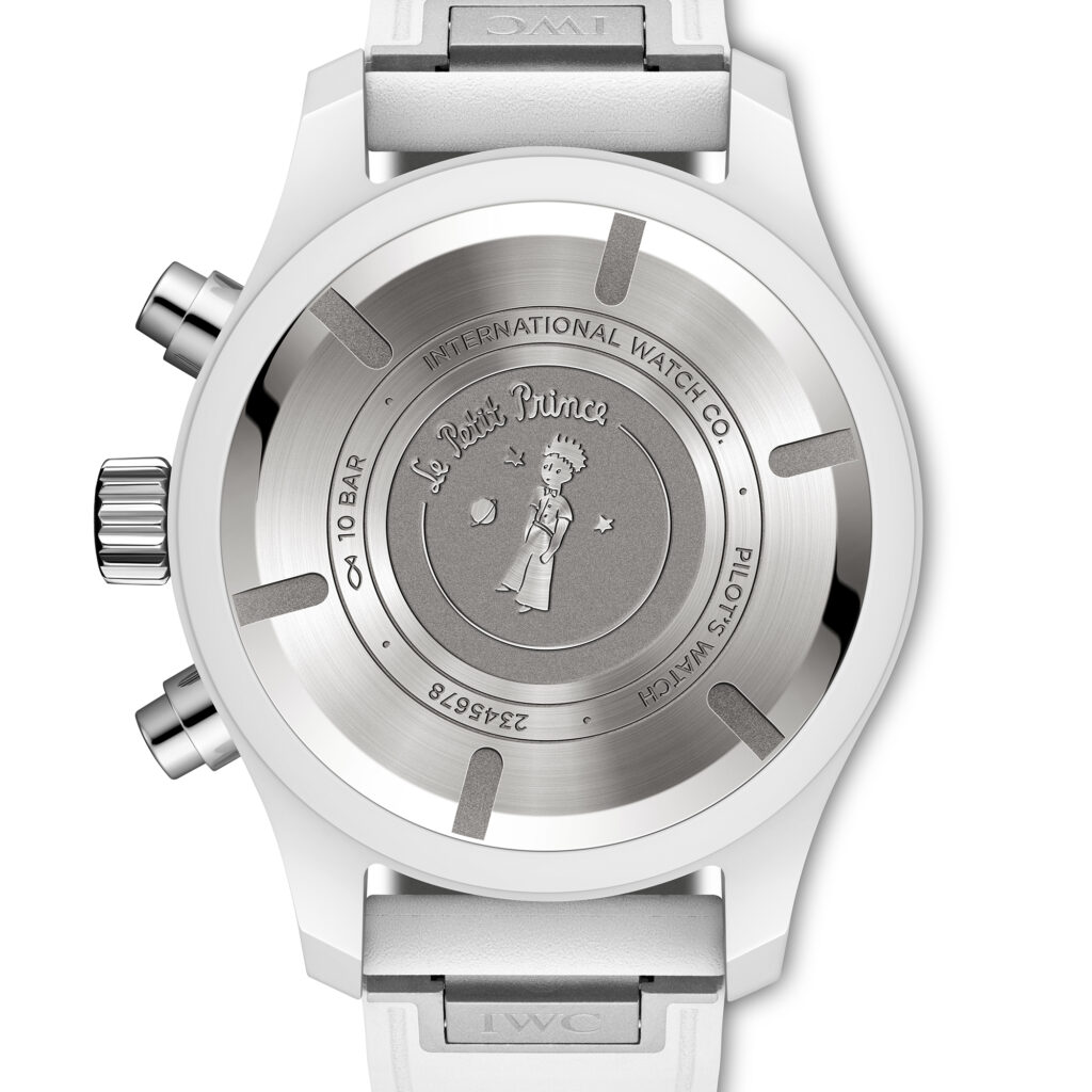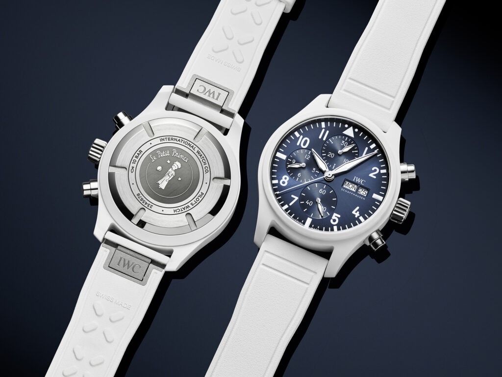 IWC Schaffhausen presenta el cronógrafo Pilot’s Watch 41 Le Petit Prince, El Principito, en Watches and Wonders 2026, Ginebra. Este cronógrafo está fabricado en cerámica de óxido de circonio blanco y se complementa con una esfera azul intenso con efecto rayos de sol y un cautivador degradado de color. Como referencia a la famosa novela de Antoine de Saint-Exupéry, el fondo de caja de titanio luce un grabado del Principito. Este cronógrafo está impulsado por el robusto y fiable calibre 69380 de fabricación propia de IWC, que incluye cuerda automática y cuenta con una reserva de marcha de 46 horas.