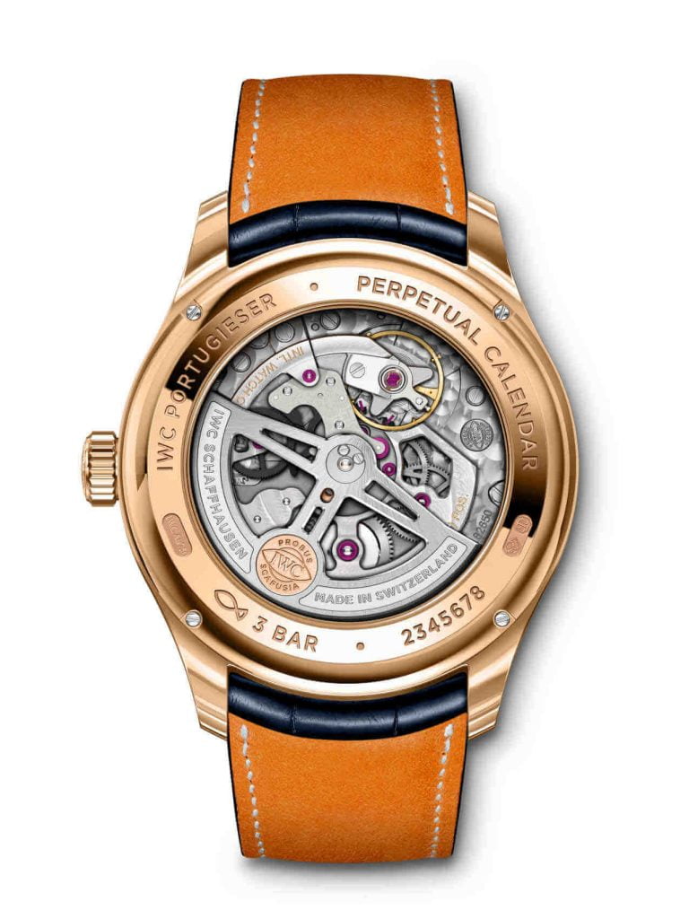 Los modelos de 42 mm tienen en su interior el calibre manufactura IWC 82650. De cuerda automática Pellaton y con una reserva de marcha de 60 horas. Parte de este movimiento se puede admirar a traves del fondo visto de cristal de zafiro. El sistema mecánico del calendario perpetuo reconoce la duración de los meses y añade un día a finales de febrero cada cuatro años.