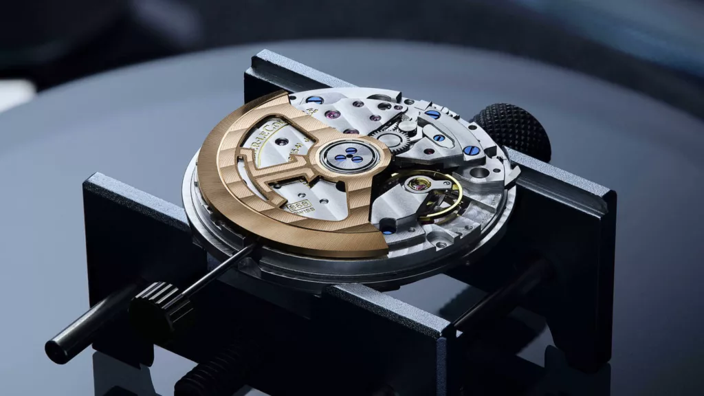 La esfera presenta un acabado lacado en color azul degradado que ofrece una distribución de fácil legibilidad y que permite visualizar las indicaciones del calendario y de las fases lunares en ambos hemisferios. Para el diseño de esta esfera se ha tomado la referencia estética del Polaris Mariner Memovox. El azul degradado sugiere la transición del día a la noche, un sutil recordatorio de la conexión entre los fenómenos celestes y la medición del tiempo. Los indicadores de la fecha, el mes y el día se encuentran a las 9, 12 y 3 horas respectivamente, y el año aparece en el indicador del mes. Las fases lunares se muestran a las 6 horas, con una indicación retrógrada para el hemisferio sur que enmarca una indicación clásica para su homólogo del norte. Las agujas esqueletadas contrastan sobre la esfera con un acabado a juego con el color de la caja,