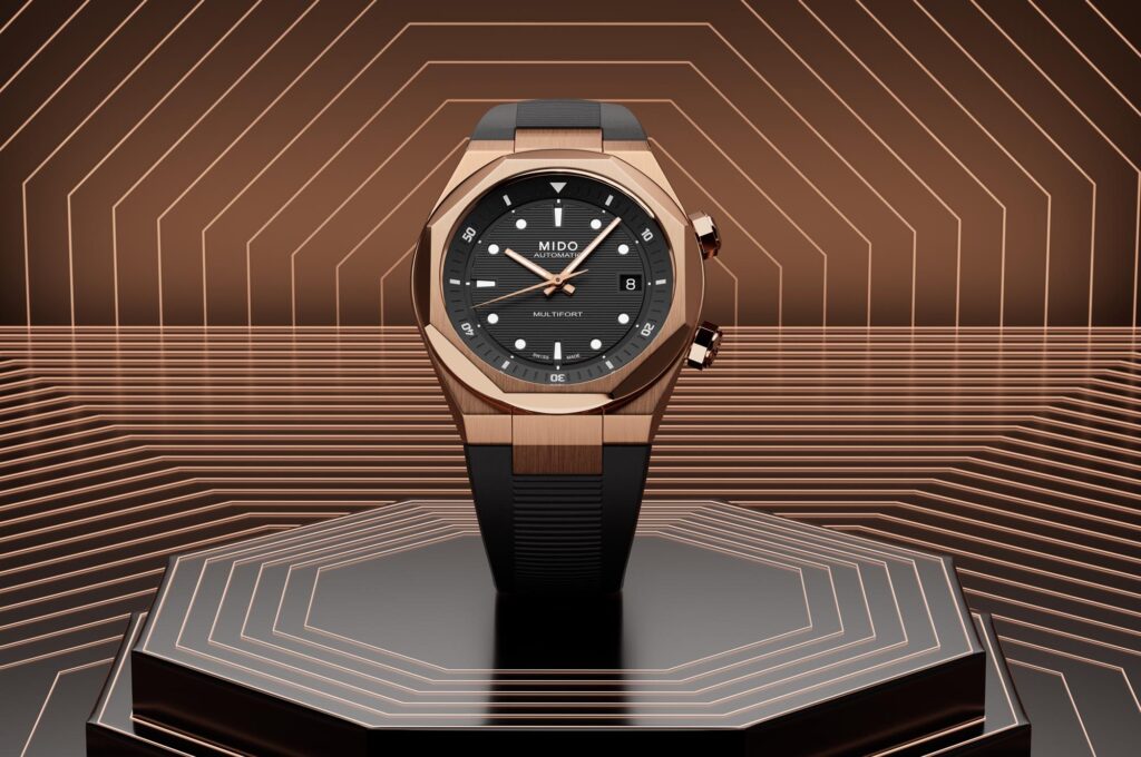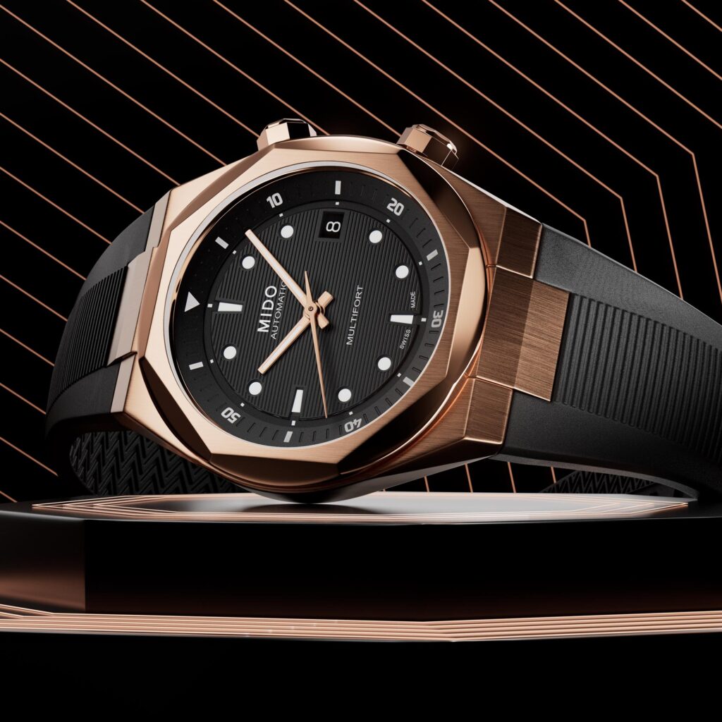 La casa Mido ha presentado su nuevo Multifort 8 Two Crown en color oro rosado. Un nuevo reloj que destaca por su combinación de color oro rosado con negro intenso y diseño geométrico. Un diseño basado en la interacción de contrastes y formas facetadas creando un estilo contemporáneo con sutiles toques clásicos. Todo ello integrando el brazalete que justo a un tamaño ajustado lo hace un modelo muy cómodo de llevar.