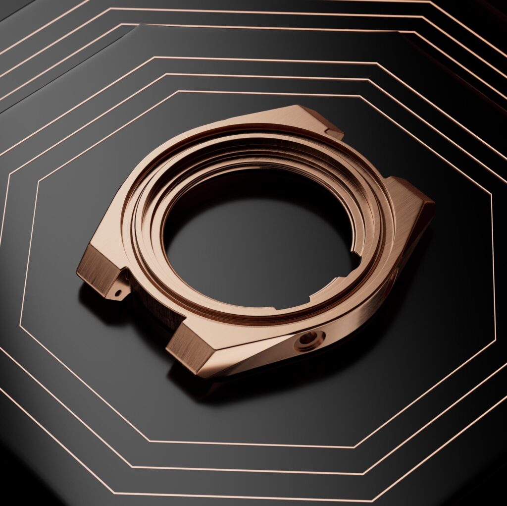 La caja es de acero con acabado satinado y pulido con tratamiento de PVD en color oro rosado un tamaño de 40 mm de diámetro. Cuenta con cristal de zafiro con tratamiento antirreflejos de 3 piezas por ambas caras. Tiene fondo visto y una resistencia al agua hasta 10 bar, 100 metros.