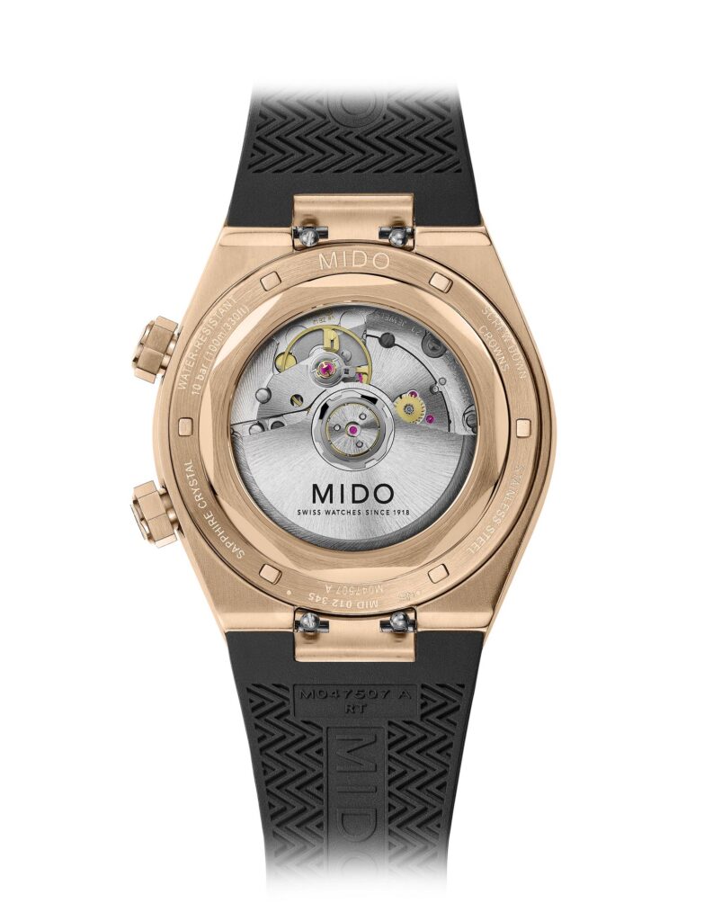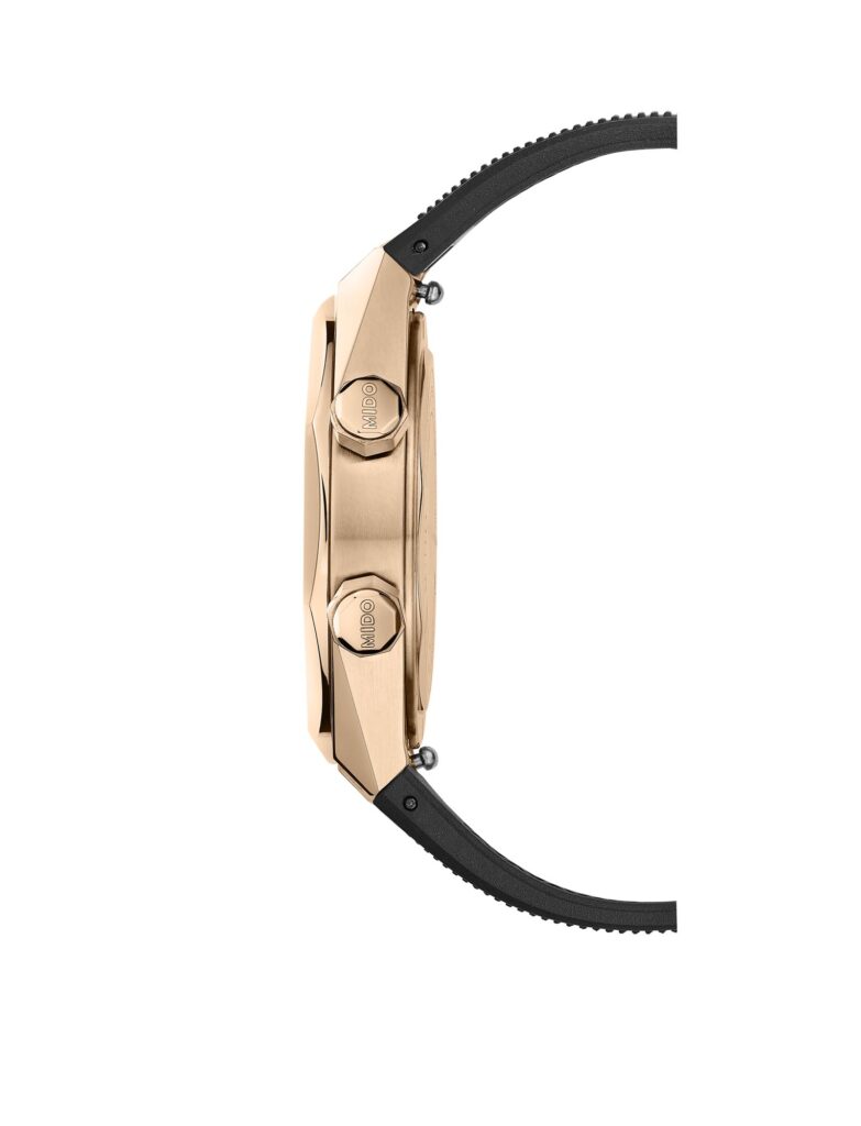 La correa es de caucho negro con motivos en relieve y hebilla de acabado satinado con tratamiento PVD color oro rosado y logotipo MIDO grabado.