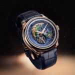 Inspirándoselos en los viajes del alpinista Reinhold Messner Montblanc presenta este nuevo Geosphere con una combinación de colores inspirados en el terreno rocoso. La esfera está lacada de marrón “fumé” a beige, con efecto humo / degradado a beige. Sobre ella contrastan los numerales y agujas de color oro rosa rellenos de material luminiscente.Los globos de los hemisferios son de color beige también con material luminescente.
