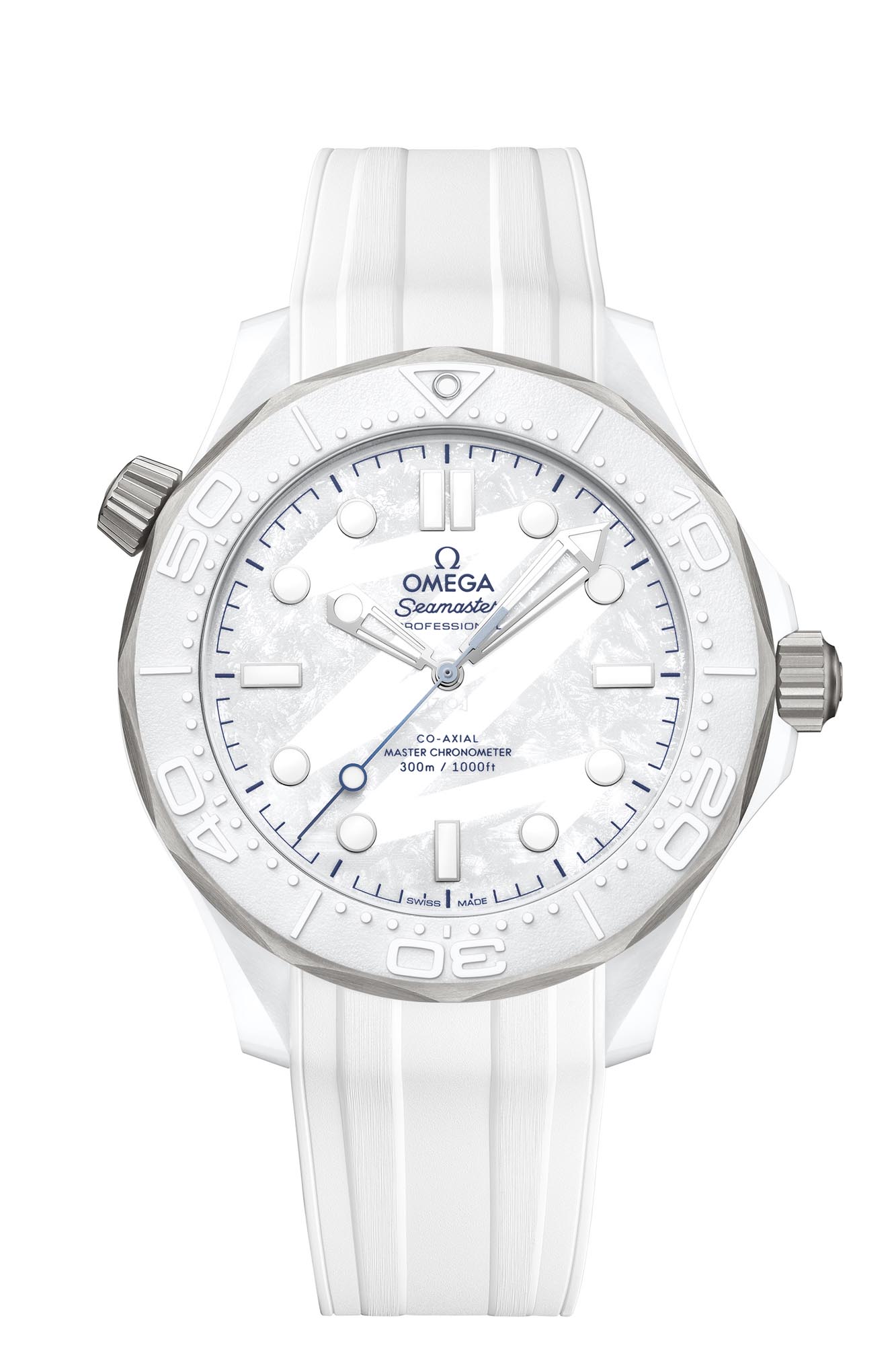 En la esfera, OMEGA ha creado un efecto único en honor a estos Juegos Olímpicos de Invierno. Fabricada en cerámica blanca, presenta un esmerilado grabado a láser con un patrón de huellas inspirado en el «26» del emblema de Milano Cortina 2026. Para completar el diseño de la esfera, las agujas e índices rodiados están recubiertos de Super-LumiNova blanca, mientras que el segundero central barnizado presenta un sutil degradado azul, un color que comparte con el logotipo de la competición