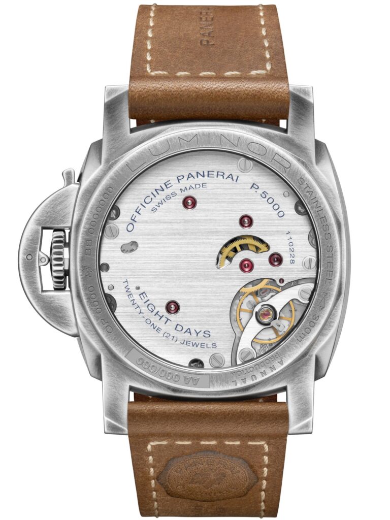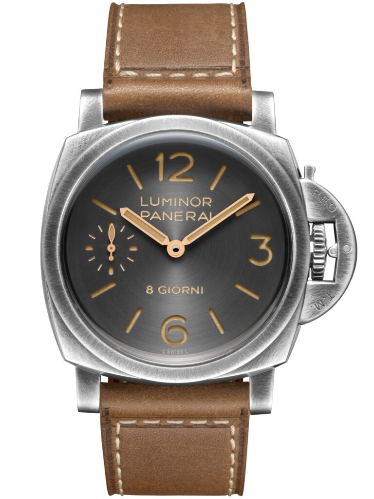 El Luminor 8 Giorni PAM01733 cuenta con un dial antracita con acabado cepillado circular, que se combina expresivamente con el acabado Brunito. Este efecto visual, logrado mediante una técnica de cepillado rotacional manual, genera microcírculos que otorgan variaciones únicas a cada pieza y una respuesta dinámica a la luz, intensificando el tono antracita bajo la luz solar. Números árabes, marcadores horarios, segundero pequeño a las 9 horas y agujas dobles tipo lápiz inspiradas en el pasado con Super-LumiNova beige. La inscripción “8 Giorni” indica la amplia autonomía y rinde homenaje al patrimonio italiano de la Maison.