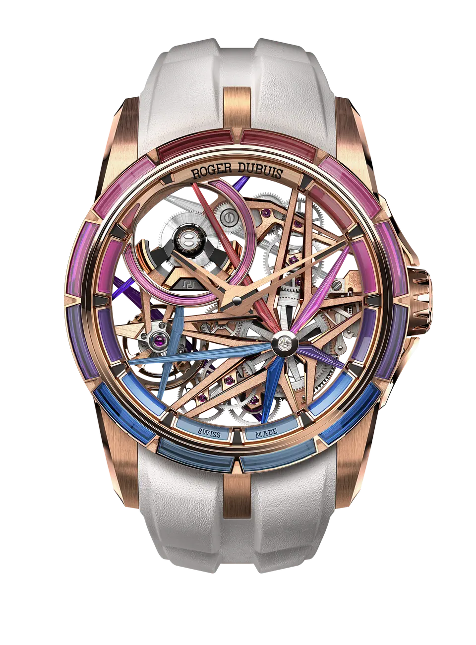 Si ya de posi las formas de los relojes de Roger Dubuis llaman la atención, ahora con este modelo lo hace mucho más. El “culpable” son las espinales utilizadas en su creación y su intenso color. Color que va del rojo al azul, y un recubrimiento de Super-LumiNova, cada una de las impresionantes espinelas está siempre brillando a pleno color, tanto de día como de noche, o bajo una luz ultravioleta. Para conseguir con exactitud los tonos, la uniformidad y la luminiscencia deseada, cada espinela se ha cultivado sintéticamente. Una técnica compleja que garantiza una mezcla perfecta de color y luz para lograr unos resultados inmejorables.