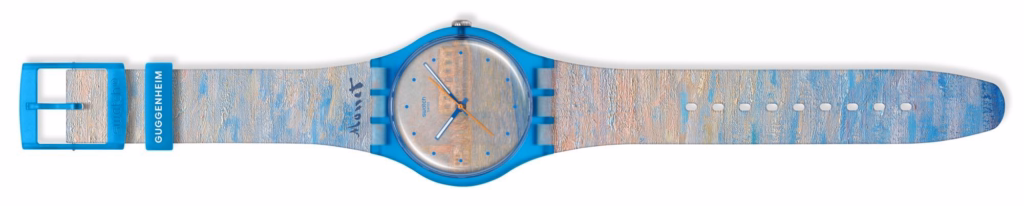 MONET’S PALAZZO DUCALE pone en valor la obra maestra de Claude Monet The Palazzo Ducale, Seen from San Giorgio Maggiore (1908). Actualmente expuesta en el Guggenheim de Nueva York, esta obra representa el majestuoso e histórico Palacio Ducal de Venecia. Así, se traza una conexión sutil entre las ubicaciones de las dos instituciones Guggenheim. El emblemático monumento veneciano, que el maestro impresionista captura con pinceladas llenas de luz, se muestra en la esfera del reloj. En las correas se aprecian los reflejos siempre cambiantes de la laguna de Venecia, en homenaje a la inigualable capacidad de Monet para representar la luz. Como toque original y divertido, la esfera de este reloj único brilla en un naranja intenso después de ser expuesto a luz ultravioleta. Así, se realza aún más la radiante belleza de Venecia, que a menudo se inmortaliza en el arte de forma simbólica como una mujer majestuosa. MONET’S PALAZZO DUCALE también está disponible con SwatchPAY!*.