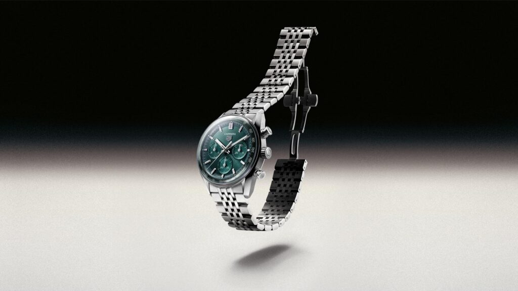 La edición en verde azulado introduce un tono intenso que se ha convertido en un nuevo color emblemático para TAG Heuer. Combinada con contadores tono sobre tono y agujas chapadas en rodio, la esfera juega con la luz y las sombras, creando un sutil juego de colores que evoluciona con cada movimiento de la muñeca, reforzando el compromiso de TAG Heuer con la legibilidad y la armonía visual.