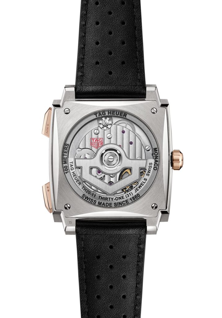 En su interior se encuentra una de las mejoras más significativas del cronógrafo TAG Heuer Monaco: el nuevo calibre TH20-11, de fabricación propia. Basado en el calibre automático TH20-00 de TAG Heuer, que se ha convertido en un elemento básico para muchos cronógrafos de la marca. Cuenta con una reserva de marcha de 80 horas y una garantía de cinco años. Tiene un diseño bicompax, con contadores auxiliares a las tres y a las nueve, y una ventana de fecha a las seis, una configuración que rinde homenaje al Calibre 11 original, de ahí su nombre: TH20-11. La referencia más visible es la corona situada en el lado izquierdo de la caja, un código distintivo del TAG Heuer Monaco.