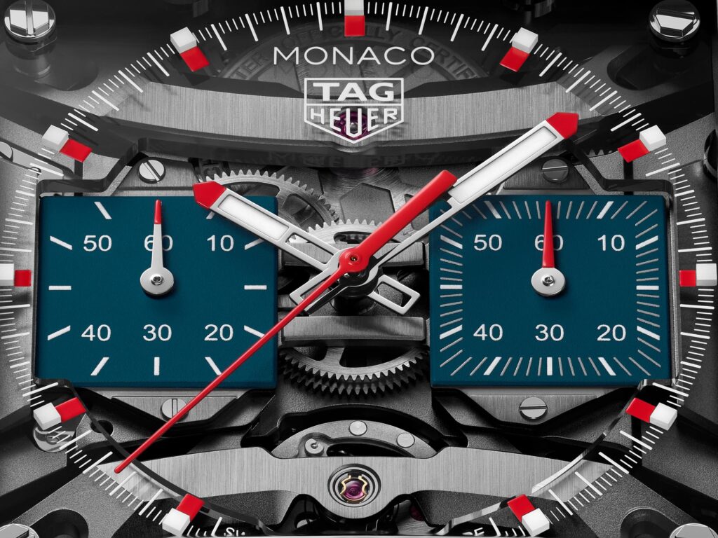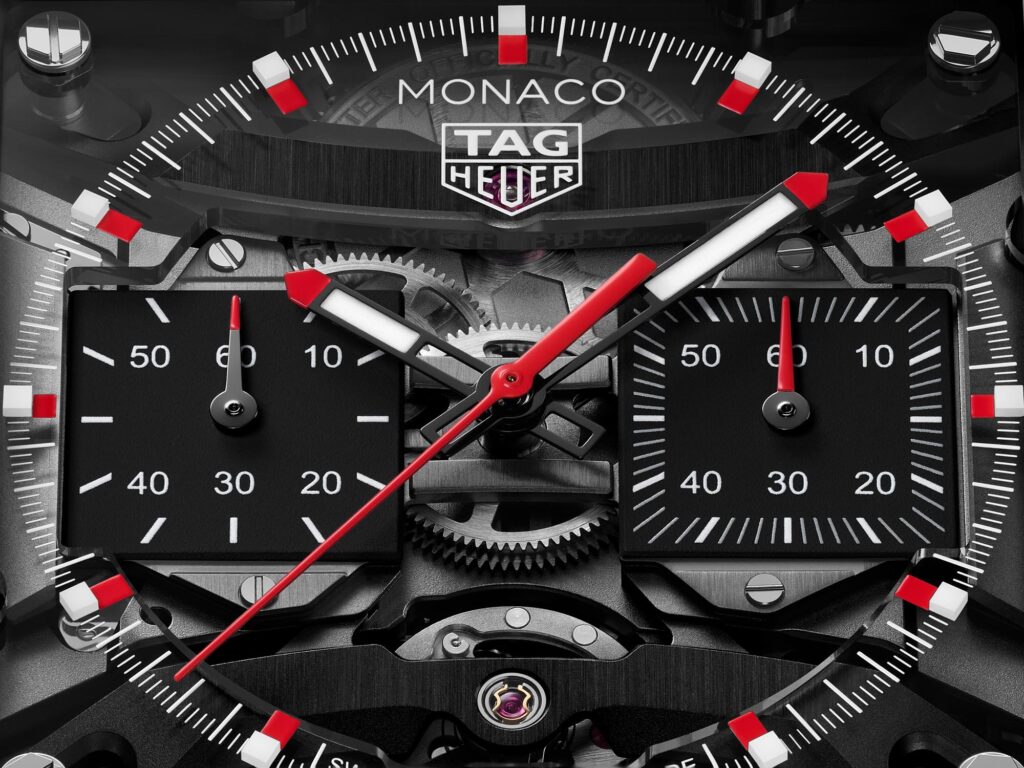 La esfera es continuista con el estilo de la colección monaco, aunque reafirma uno de las principales novedades de este reloj, su calibre. Una esfera de Cristal acrílico transparente, con marcas blancas y rojas e índices aplicados de Superluminova blanca, que deja ver puentes con acabado cepillado fino y pulido con chorro de arena, recubiertos de DLC negro. Tiene dos contadores a las 3 de minutos y a las 9 pequeño segundero.