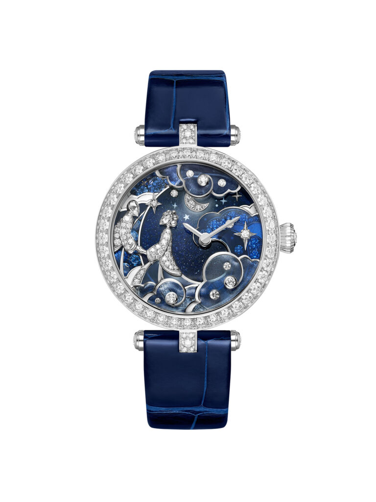 Complementándose entre sí, los relojes expresan el melancólico encuentro de estos amantes y el éxtasis de su reencuentro. Una mezcla de azules, el reloj Lady Rencontre Céleste retrata a la pareja, con las manos entrelazadas, enmarcada por un cielo estrellado. Su silueta de oro blanco aparece tras nubes brillantes adornadas con diamantes engastados.