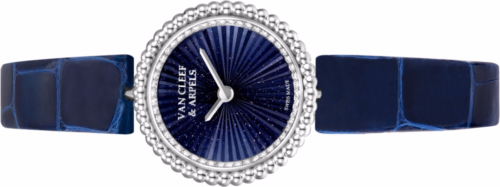 Bajo el cristal ligeramente convexo, la esfera revela una decoración en cristal de aventurina, cuyos matices azul medianoche reflejan la inmensidad del cosmos. El material presenta un guilloché radiante , una técnica innovadora que enriquece aún más el juego de luces. Su intenso brillo añade vitalidad al paso del tiempo, medido con sólidas agujas. El borde de la caja, engastado con diamantes, reproduce el diseño del bisel, que también presenta diamantes seleccionados por los expertos gemólogos de la Maison según los más altos estándares de calidad. Un botón en la parte posterior de la caja ajusta la hora sin ser visible en la muñeca. El reloj incluye una correa de piel de cocodrilo intercambiable, además de una segunda correa a elegir entre los diferentes colores de la colección. Fáciles de colocar y quitar, las correas se pueden intercambiar según las preferencias del usuario.