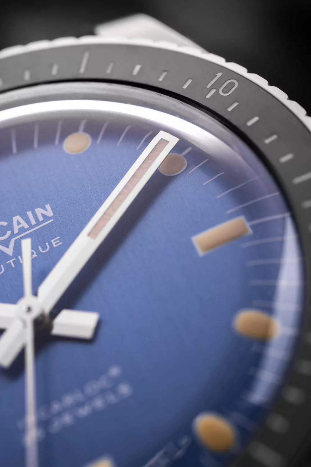 Las esferas consigue el estilo del modelo de los años 60 en cualquiera de las dos versiones. Es complicado decidir cual nos gusta más de los dos modelos, negro mate o azul con el bonito cepillado vertical. Sobre las esferas contrastan los indices y agujas cromadas con Super Luminova Tostado. Acertado tono que potencia el estilo vintage.
